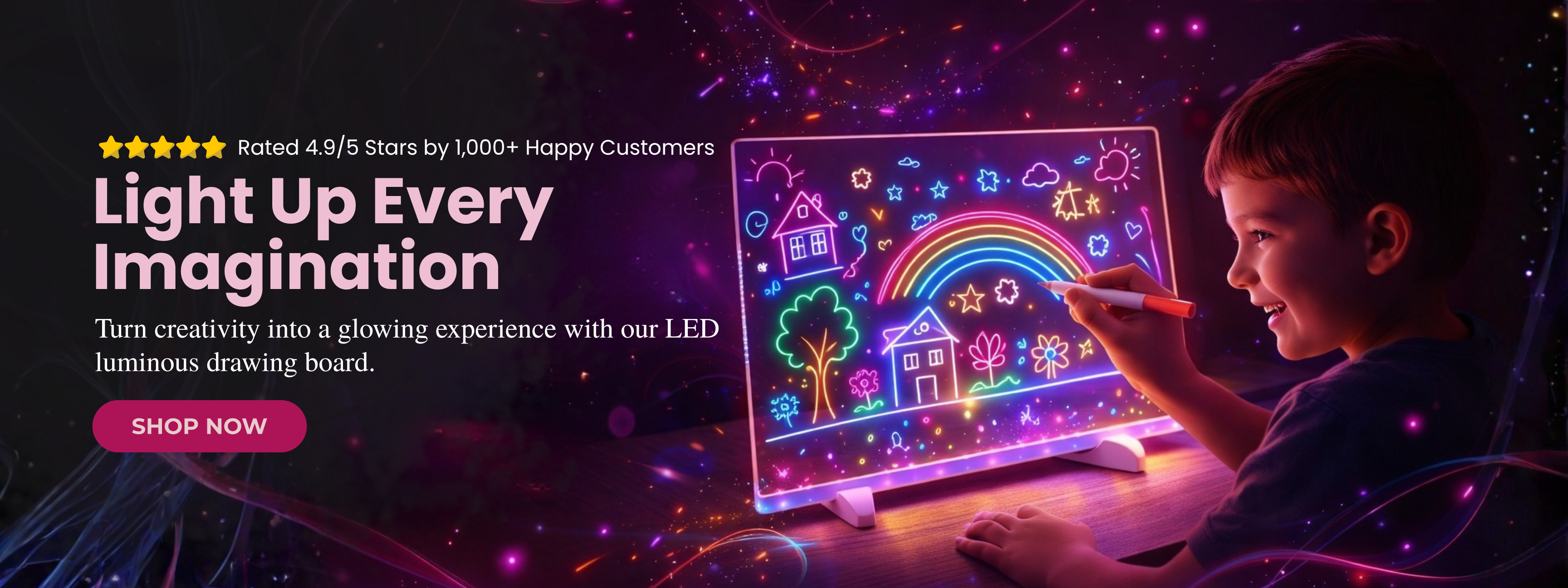 Each package typically includes a light-up drawing board, neon markers, and additional accessories or templates, depending on the variant.